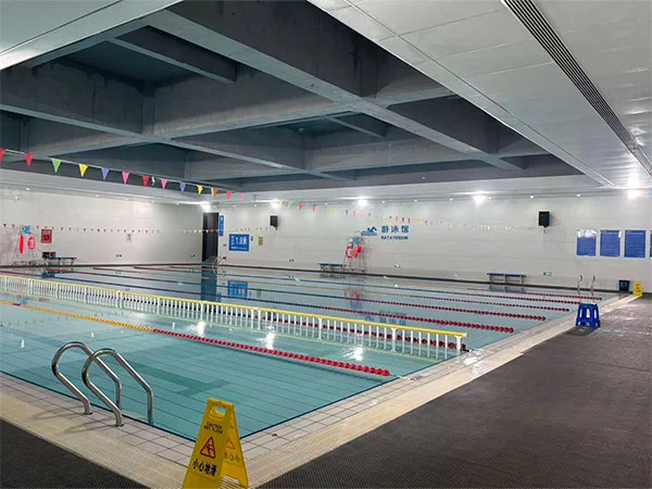 Mặt ngoài của bể bơi nổi bật với hệ thống tấm vảy cá bằng kim loại, tạo hiệu ứng ánh sáng và bóng tối giống như vảy thay đổi theo độ cong của mặt tiền và hướng ánh sáng mặt trời, tăng cường “dòng nước”. Toàn bộ cấu trúc mái của khu vực bể bơi trong nhà lộ ra ngoài, với một giàn kéo dài 48 mét, nhấn mạnh sự thể hiện rõ ràng về logic cấu trúc và củng cố quy mô không gian cũng như cảm giác về sức mạnh của địa điểm thể thao. Địa điểm có hai hồ bơi: hồ thi đấu và hồ luyện tập. Bể thi đấu dài 50m, rộng 25m, có 8 làn xe; bể tập dài 50m, rộng 17m, có 6 làn xe. Cả hai hồ đều sâu 2 mét.